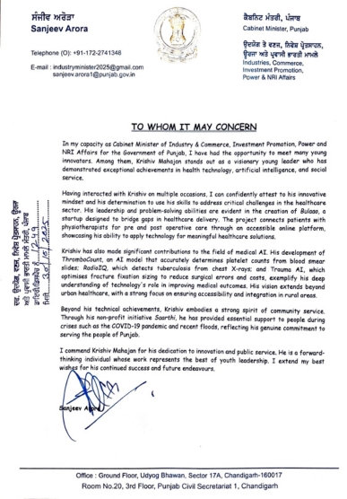 I was awarded an appreciation letter by Shri Sanjeev Arora, Cabinet Minister of Industry & Commerce, Investment Promotion, Power, and NRI Affairs, Government of Punjab, for my exceptional achievements in health technology, artificial intelligence, and social service.